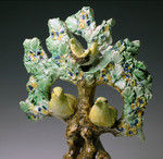 A rare late 18th century pottery pearware figure of birds perched in leafy branches with a nest with two chirping chicks. The figure is decorated in underglaze oxide Pratt type colours.