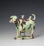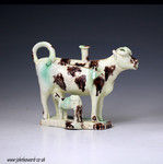 A rare creamware bodied pottery figure of a standing cow with suckling calf in the form of a creamer.