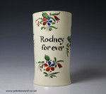 English creamware pottery tankard with inscription RODNEY FOR EVER. Late 18th century