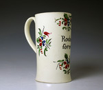 English creamware pottery tankard with flowers and foliage enameled decoration and inscribed "Rodney for ever".