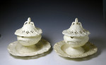 A fine pair of antique creamware pottery tureen with covers and stands, probably Leeds Pottery Yorkshire late 18th century period. The covers have reticulated decoration with a vine twist handle with floret and leaf terminals. The stands are probably "matched" to the tureens and are also decorated with reticulated borders. A very handsome set of exceptional quality.