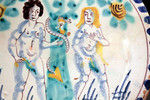 The charger is decorated in polychrome colours with the classic image of Adam and Eve, complete with snale and apple. The leaves surrounding the pair are very strategically placed reflecting at the loss of innocence and the inception of original sin!