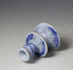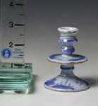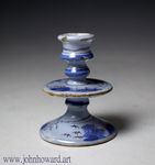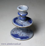 An exceptionally rare English delftware pottery candlestick of diminutive size. The shape is derived from period metal work examples. The bluish tin glaze is decorated in the Ming transitional fashion.