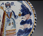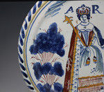 A fine and rare English delftware pottery blue dash charger with the royal portrait of Queen Anne and initials A R. The Queen is crowned and holding an orbe and sceptre. Bristol or Brislington delftworks.