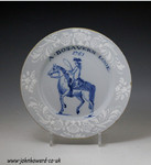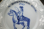 English deltware pottery dish painted in the manner of James Seymour with a horse and rider and named A.Bosavern Looe above the date 1761 with a bianco -sopra- bianco border.