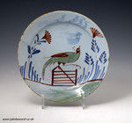 A rare English pottery delftware plate decorated with a pheasant perched on a gate.