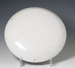 The pancake shaped dish is decorated in blue and white with two male figures standing under a sponge idealized tree in a rural setting.