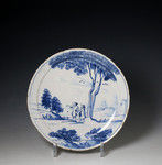 English delftware plate with scene of two figures in a rural landscape. Lambeth London mid 18th century