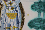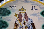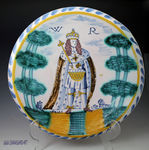 London delftware blue dash charger circa 1695. Decorated in green, yellow, ochre and manganese with a full striking full length portrait of King William 111. The King is dressed in Coronation Robes and crown whilst holding an orb and sceptre and is flanked by the initials WR. (William Rex)