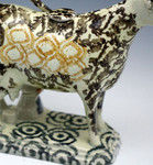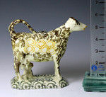 An unusually decorated pottery cow creamer from the early 19th century.