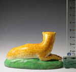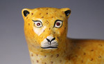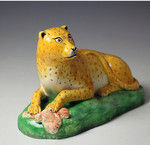 A fine and rare creamware pottery figure of a leopard on a green base with a paw resting on a piece of meat. The figure is exceptional quality and dates to the early 19th century, Staffordshire England.