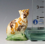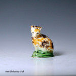 A charming English pottery figure in Pratt colours of a demure looking cat seated on a green base.