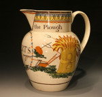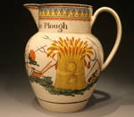 The jug has The Farmers Arms and various agricultural implements as part of its strong and decorative appeal. Interesting the jug also bears the name under the spout ROBERTS as well as the legend GOD SPEED THE PLOUGH.