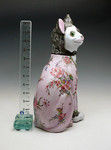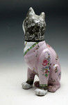 A good Emile Galle comical pottery figure of a seated cat with glass eyes and dressed in a dark pink chintz outfit with a black lace cap. The cat wears a locket with image of a dog to complete the charming impact.
