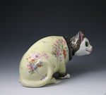 A very rare amusing pottery figure of a smiling crouching cat with a nodding head. The glass eyed cat is decorated in the stylised Emile Galle fashion with flowers and a lace cap. The weighted head is modeled separately to the body and is suspended by a hook and pin at the neck. The cat is wearing a locket with the image of a dog which adds a further touch of humour to this charming piece.
