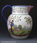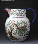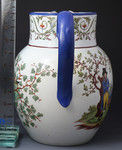 A rare Staffordshire pottery pitcher exceptionally well decorated. One side shows a standing figure of a youth with a top hat walking with his dog in an English rural landscape the decoration is typical English style of the late 18th/early 19th century period. The reverse image is Chinese influenced picture delicately rendered of birds on nests with tree branches and berries and leaves. The elaborate border decoration is in the Italian style.