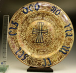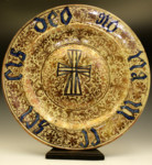 The centre panel of the charger is decoarted with a blue cross and there is lettering around the outer rim also in cobalt blue.