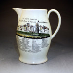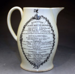 Pottery jug with transfer prints in underglaze of the Bidston Lighthouse with shipping signal flags. Herculaneum Pottery Liverpool.