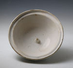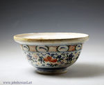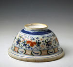 An unusual and rare English delftware pottery bowl decorated with flowers and leaves in polychrome colours. There is a one inch high spike in the base of the bowl which is thought to hold a pat of butter. The cover to this bowl maybe lacking.