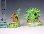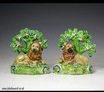 Pair antique Staffordshire pottery figures of lions with bocage marked Walton. early 19th century