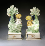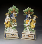 Antique Staffordshire or Yorkshire pair of pearlware bocage figures decorated in pratt colors on square bases. This pair of early figures date to circa 1790 period. It is quite rare to find a true pair of these prattware musician figures.
