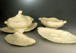 Creamware pottery lidded tureens and stands in silver shape.