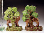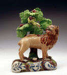 A very rare pair of Staffordshire pottery pearlware figures of a lion and lioness standing before an unusual and decorative shaped bocage. The lions are amusingly snarling at a comical looking snake which is peeking out of the branches of bocage.