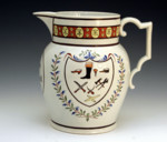 The jug is decorated in enamel colours with implements from the boot and shoe makers trade.The pitcher is named and dated "James Hucknall 1805".