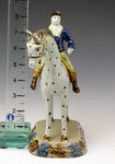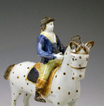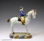This pottery figure is modelled with the rider wearing a flat top hat, the horse has a docked tail. Note the classic dots over the eyes, a feature almost uniquely adopted by the Yorkshire potters.