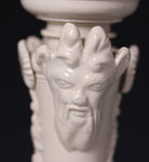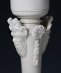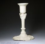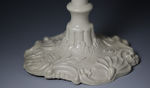 A very fine and exceptionally rare white saltglaze stoneware candlestick with sconce. The base is strongly relief moulded in the rococo style, the stem has quality stylish embellishments of flowers and Bacchus type heads. Miraculously the candlestick retains it original detachable sconce.