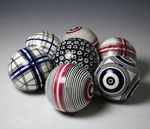 A fine and colourful group of seven pottery carpet balls of various designs.