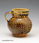 17th century earthenware slipware tankard with trailed and combed decoration. The mug is thistle shaped and similar decorated fragments have been located at various sites in Staffordshire The quality decoration on this piece leads to an assessment of date as late 17th century.
