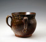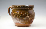 A rare fine example of a Wrotham earthenware two handled mug with slipware decoration. Of baluster form with well applied loop handles, decorated in cream-coloured slip on a brown ground finished with a lustrous glaze, dated 1738 among dots and dashes and initialed WF. During the 17th and 18th century it was a common custom to literally share a drink with your partner which is why so many vessels were made with two handles.