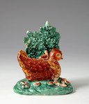 A rare and appealing Staffordshire pottery figure of a hen with a chicks including one on her back set against bocage.
