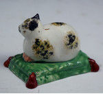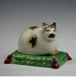 Antique Staffordshire figure of a recumbant cat on a tassled cushion.