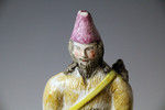 The book titled Robinson Crusoe by Daniel Defoe was published int he early 18th century. Crusoe is modelled with good detail with attention given to his survival tools, a gun,axe, swag bag and powder horn. The story was turned into a play and was performed in English theatres in the late 18th and early 19th century. The enduring story of a castaway marooned on an island for 28 years captures the imagination, it is likely that this figure was produced as a memento of the theatrical production.
