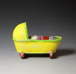 Staffordshire pottery baby asleep in a canary yellow ground cradle. Antique English period early 19th century