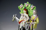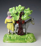 A fine pottery pearlware figure of the " Return from Egypt" with Joseph standing with staff and Mary holding the infant Jesus whilst sitting on a donkey. The figure is modelled with "Sherratt" oak leaf bocage with exceptional enamels and decoration, the base ( unique to Sherratt) with it rainbow colours and specific shape adds additional decorative appeal to the group.