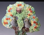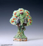 An amusing and highly appealing colorful Staffordshire pearlware pottery figure group with two birds perched in branches. The unique double leaved bocage is especially well modelled with exceptional detail to leaves and fruit.