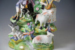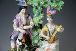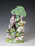 A very fine pearlware pottery bocage type figure of musical shepherds with animals on a highly decorative base. The figure is exceptionally modeled with much attention to detail with the best enamel decoration.