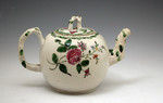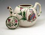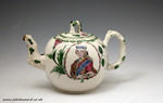 The teapot is decorated with a portrait of Bonnie Prince Charlie in a cartouche bordered with a thistle and white rose. The piece would date from the mid 18th century