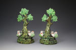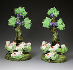 A rare and endearingly delightful pair of Staffordshire pottery pearlware figures with interesting bocage (Anthemion Group). Each figure shows five sheep on a grassy bank all nestled under a tree.