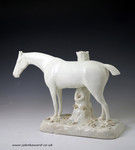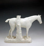 The figure of the horse is well modeled with a fine pearlware glaze.The base is interestingly decorated with extruded clay, leaves and flowers specifically attributed to the Wood and Caldwell pottery.