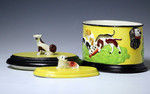 Staffordshire pottery pearlware toboacco box with figures of dog and sheep finials