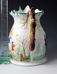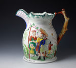 Staffordshire pottery commemorative pitcher illustrating the story with relief images of Smith and Collier circa 1866. One side of the pitcher shows Collier the poacher/farmer in the cottage homestead with his wife and one of his seven children. The other side shows the scene of the crime where Collier is charged with killing the gamekeeper Smith. The handle of the jug is molded with a game rabbit. Interestingly the piece has a presentation legend across the base which read "PRESENTED TO JAMES MORREY BY A FRIEND". A rare and strong decorative pitcher with a story of the time to tell.