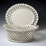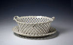A fine English saltglaze stoneware pottery basket and stand with elaborated reticulated and relief decoration. Made in Staffordshire in the mid 18th century.