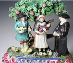 Antique English pottery pearlware bocage figure known as the Tythe Pig Group.