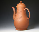 Staffordshire unglazed Redware Coffeepot and Cover, England, c. 1755, pear shape with molded basketweave handle and fluted spout, applied floral framed oval cartouches with Chinese figures and flying bird. A pseudo Chinese chop mark is impressed into the base.