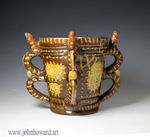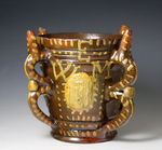 A rare large sized Wrotham slipware dated flared cylindrical form puzzle tyg with four hollow loop shaped handles. The dark brown ground is profusely decorated with cream coloured slip with stud and dotted embellishments. The rectangular central panel is dated in relief 1696 above another panel with the potters initials I E (perhaps John Eaglestone). The owners initials in monogram and in triangular form W E M are interspersed with dot and dash motifs and there are various applied pad prunts including a fleur de lys and another with the Arms of Amsterdam.